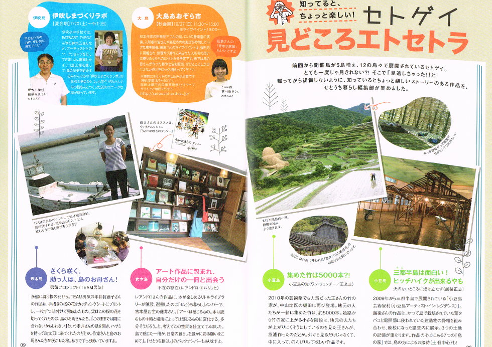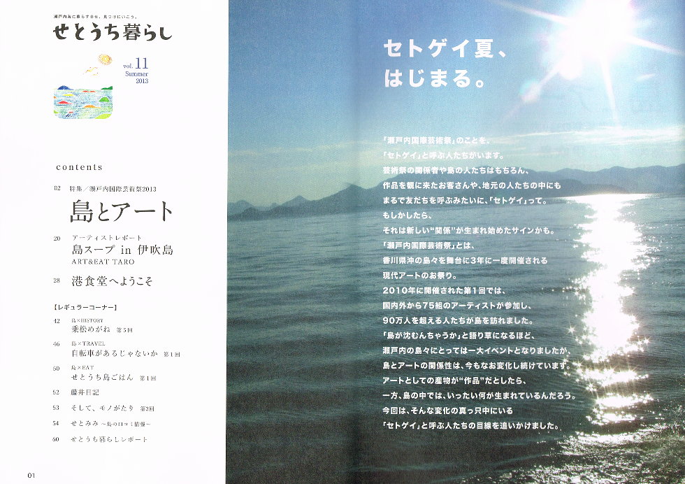 瀬戸内海に浮かぶ島々を舞台に、3年に一度開催される現代アートの祭典「瀬戸内国際芸術祭2013」を、島からの目線で追いかけました。アートを通して、島ではいったい何が生まれているのか。その他、編集部オススメの見どころやセトゲイ攻略法、アート+島を両方楽しむための欲張りツアーコースなど、地元ならではの細やかなガイド情報満載です!