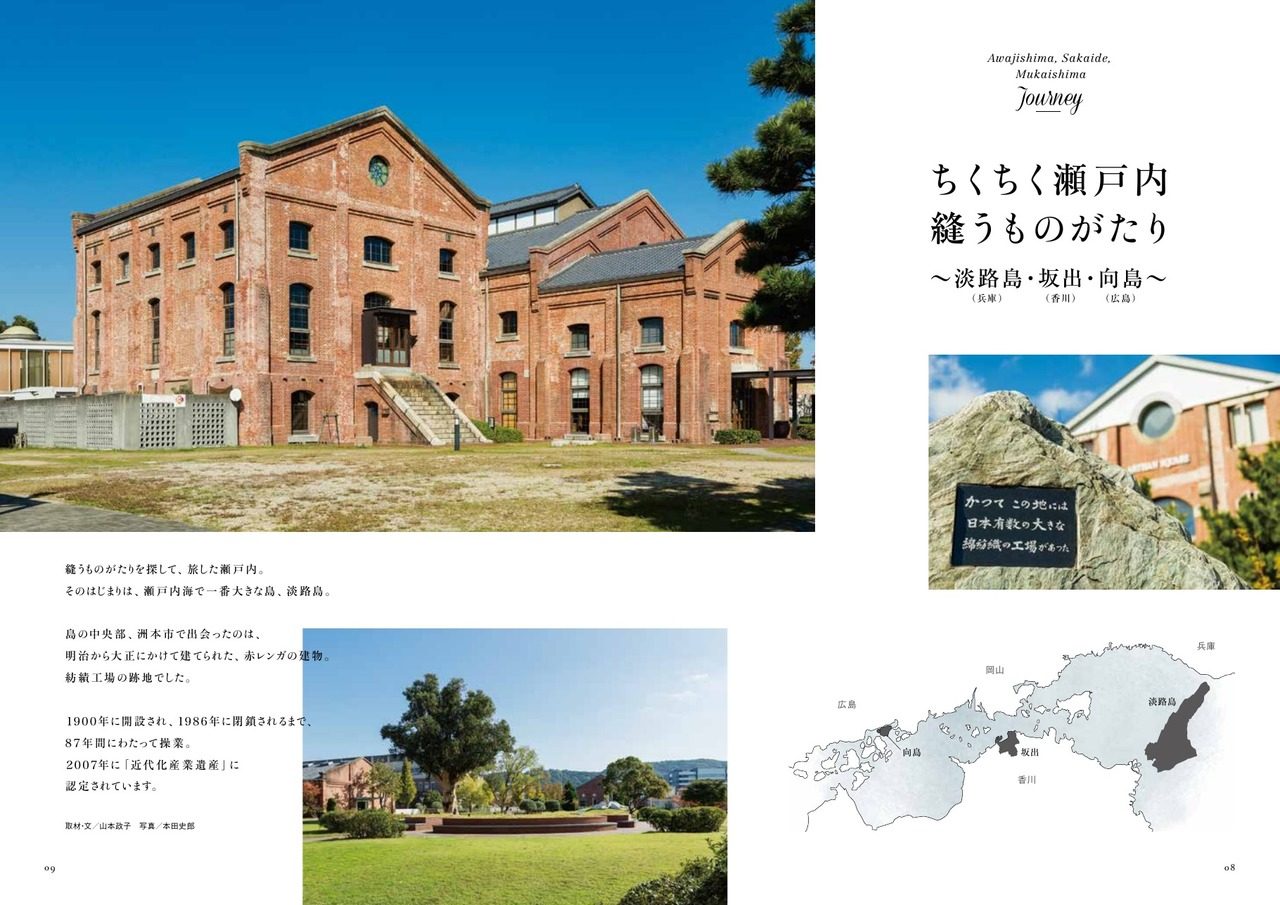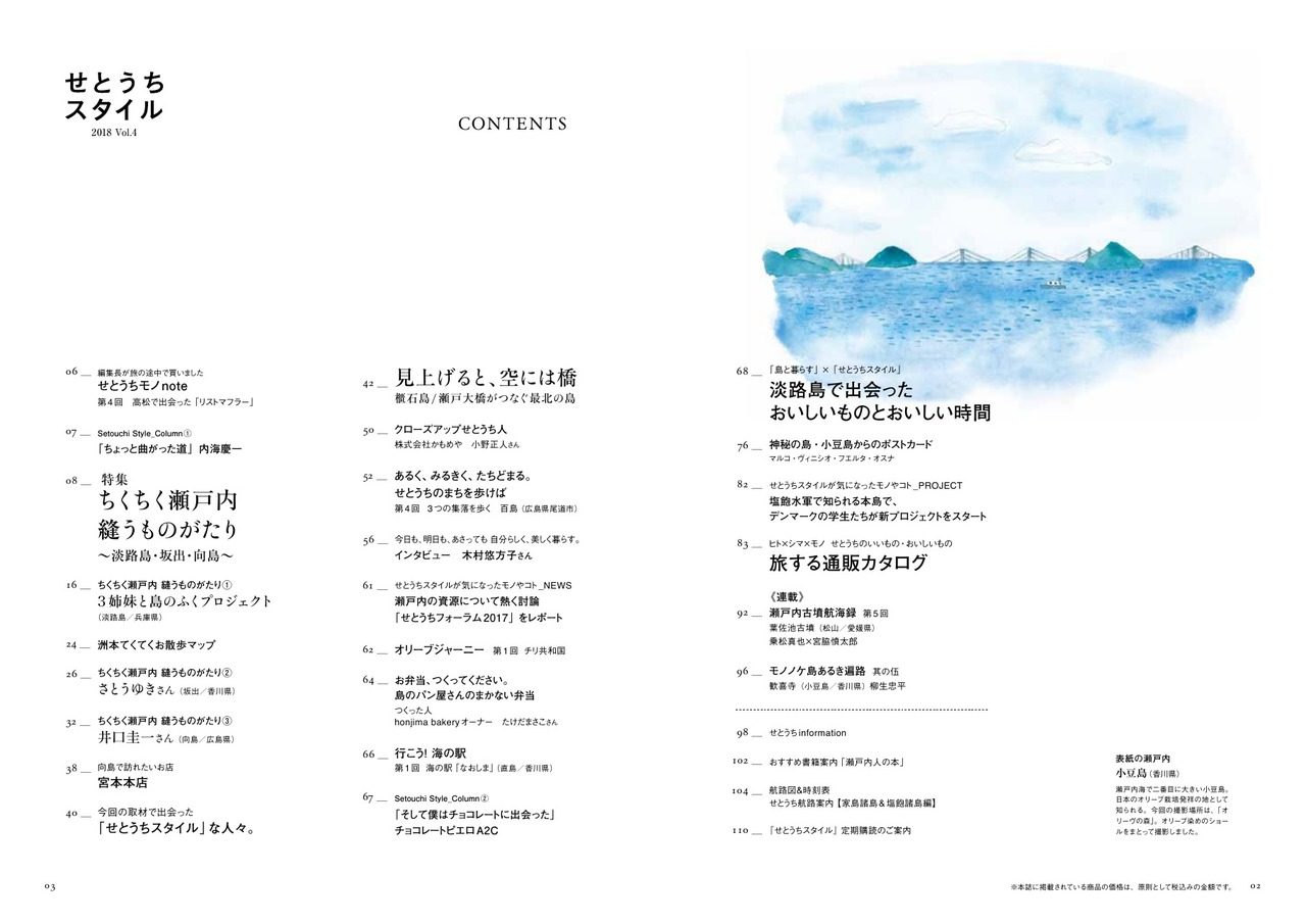 そのほか、編集長が旅の途中で思わず買ってしまったものを紹介する「せとうちモノnote」/地元の方とともにまちあるき探訪「せとうちのまちを歩けば」/メキシコ人の写真家マルコさんが撮影し続けた小豆島(香川県)の風景/新連載「行こう!海の駅」/瀬戸内に暮らす歴史研究家と写真家がめぐる「瀬戸内古墳航海録」/瀬戸内の情報満載「せとうちinformation」など。