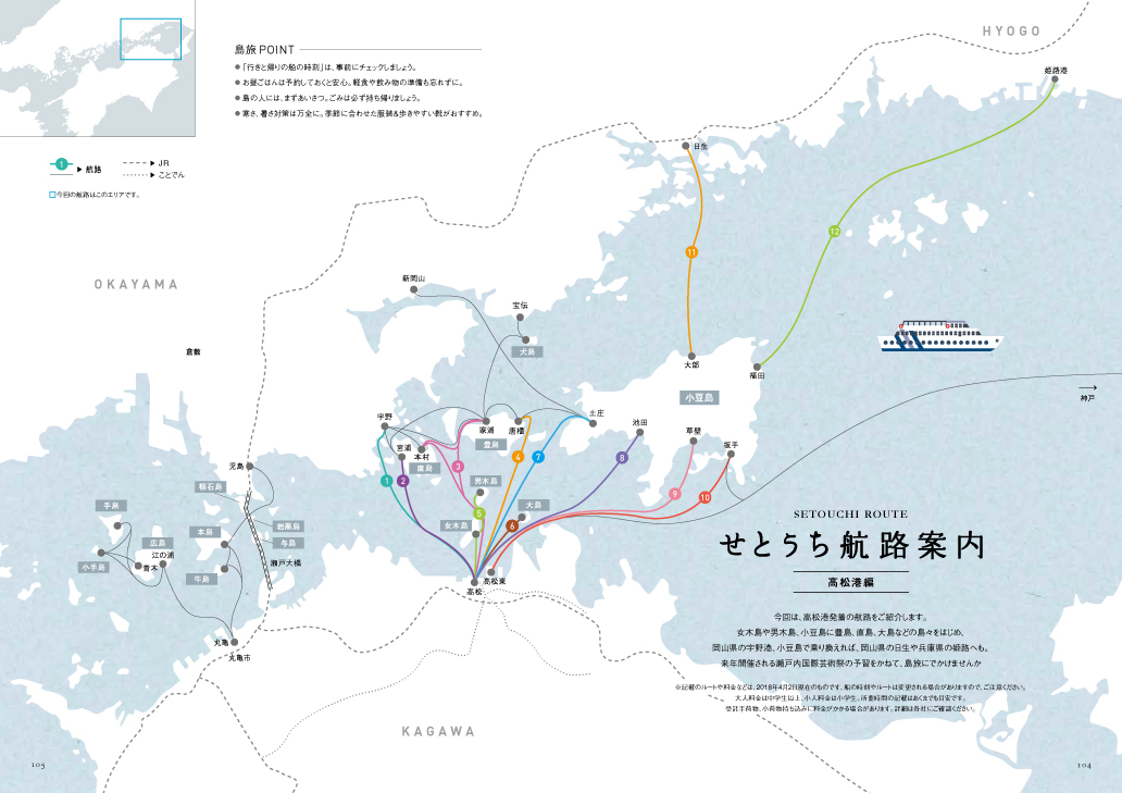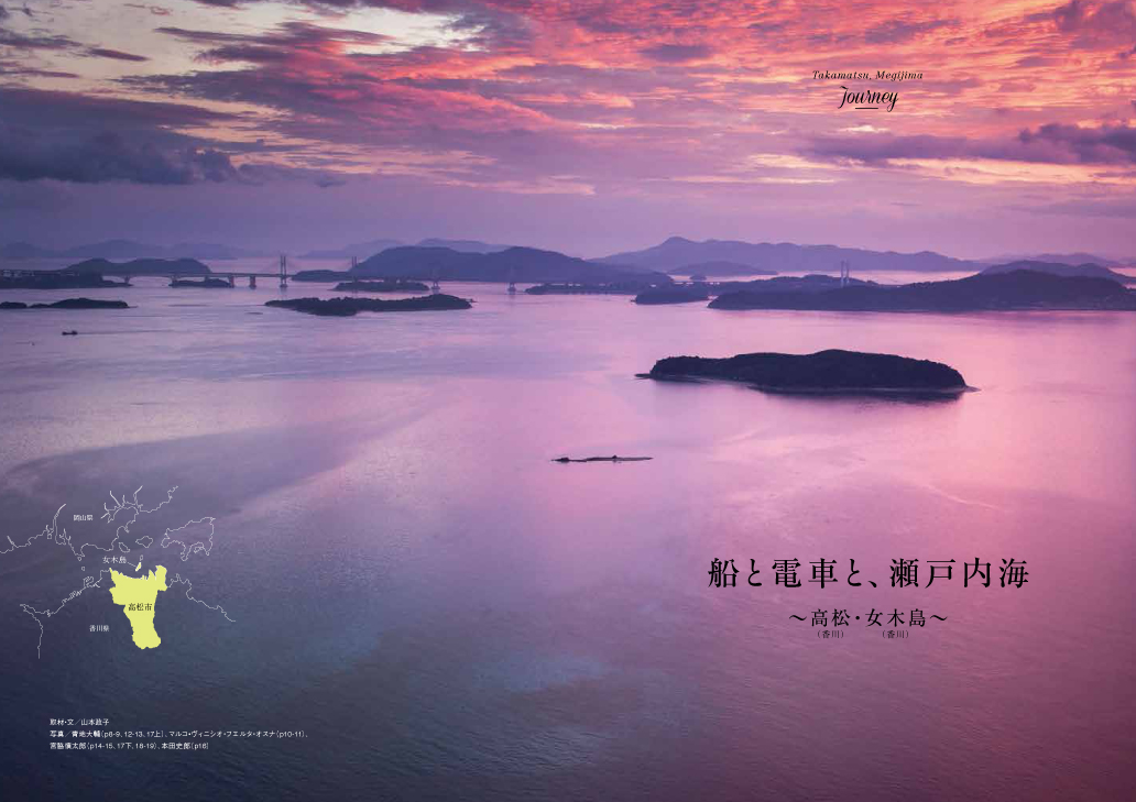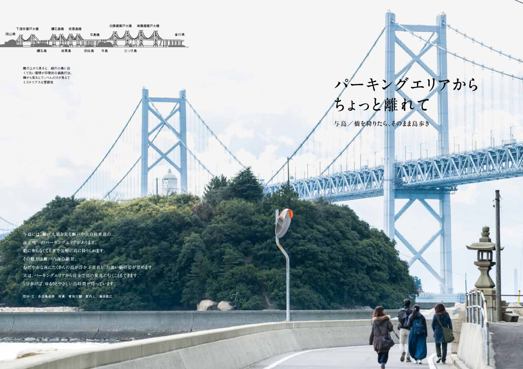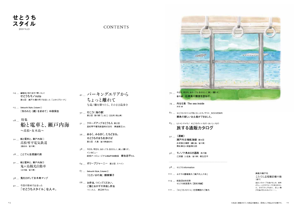 そのほか、編集長が旅の途中で思わず買ってしまったものを紹介する「せとうちモノnote」/地元の方とともにまちあるき探訪「せとうちのまちを歩けば」/写真家・木村孝さんが撮影する瀬戸内の風景/瀬戸内に暮らす歴史研究家と写真家がめぐる「瀬戸内古墳航海録」/瀬戸内の情報満載「せとうちinformation」など。