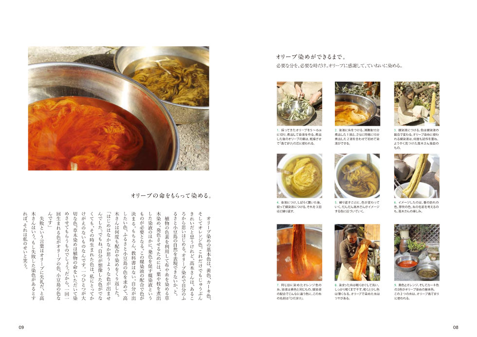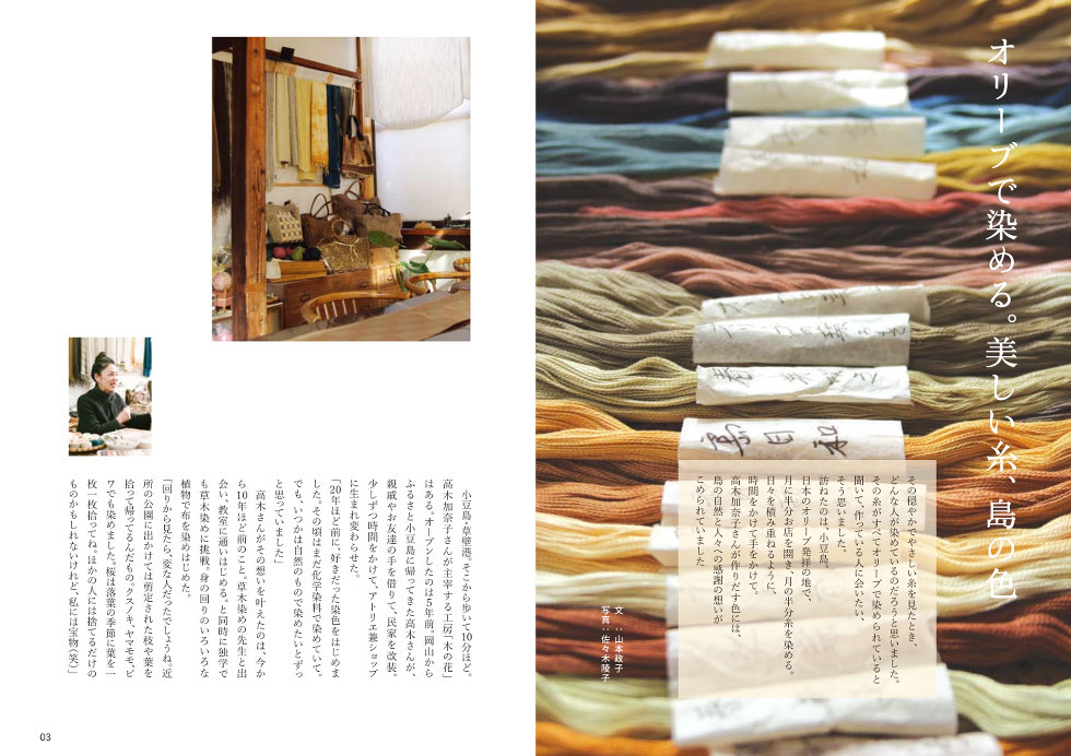 その穏やかでやさしい糸を見たとき、どんな人が染めているのだろうと思いました。その糸がすべてオリーブで染められていると聞いて、作っている人に会いたい、そう思いました。訪ねたのは小豆島。日本のオリーブの発祥の地で、月に半分お店を開き、月の半分糸を染める。オリーブ染め工房「木の花」が作りだす色には、島の自然と人々への感謝の想いが込められていました。